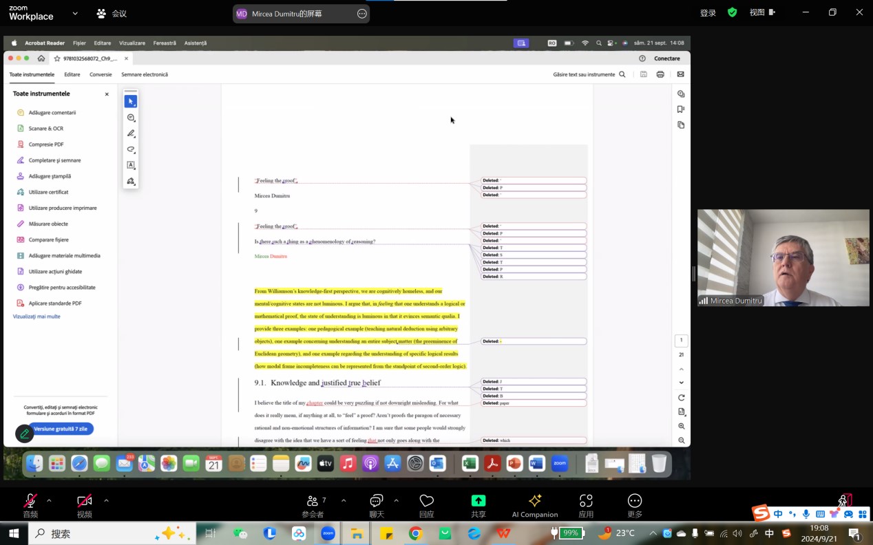 本网讯(通讯员 鲁彦君) 9月21日晚,应成人视频 陈波教授邀请,哲学教授、罗马尼亚科学院副院长、欧洲科学院院士,国际哲学院(IIP)院士及前主席,米尔恰·杜米特鲁(Mircea Dumitru)做题为“‘感受到一个证明’:存在像推理现象学这样的东西吗?”的讲座。讲座由成人视频 程勇教授主持,四川大学哲学系徐召清副教授评议。来自国内外的110余名听众参与本次线上讲座。