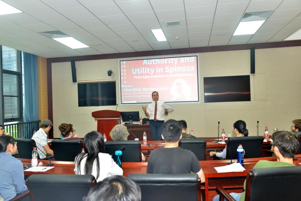 本网讯(通讯员:晏临风)2018年9月27日下午,澳大利亚西悉尼大学人文与传媒艺术系教授德米特里·瓦多莱基斯(Dimitris Vardoulakis)在振华楼成人视频 B214做了题为“斯宾诺莎思想中的权威与功利:从伊壁鸠鲁主义到新自由主义”的讲座。他讲座中的主要观点在于,斯宾诺莎受到了伊壁鸠鲁主义的影响,因此他才在著作中对于权威与功利的辩证关系进行了探讨,进而我们能够通过伊壁鸠鲁的观点更好地理解斯宾诺莎的伦理学政治哲学;讲座中,德米特里教授也梳理了伊壁鸠鲁主义的历史沿革,并且认为功利主义在新自由主义的时代背景下能够起到积极作用。在互动环节中,现场的师生积极参与探讨。