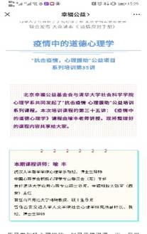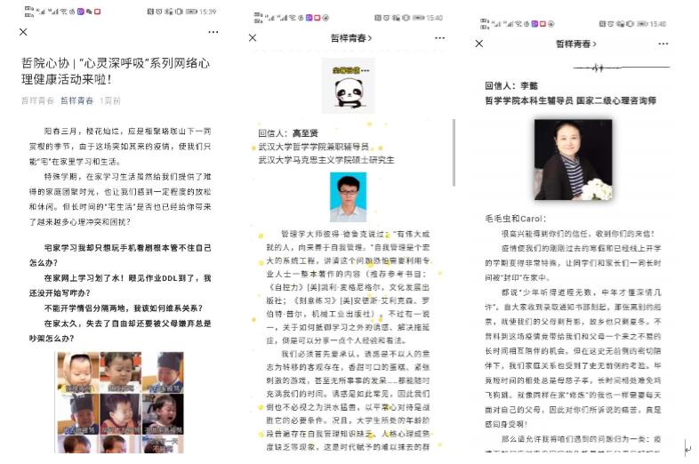 网络心理送关爱。针对学生“宅家上学”心理冲突和困扰,面向全院同学推出了抗疫情期间“心灵深呼吸”系列网络心理健康活动,每周五天通过学生官微平台投放心有灵犀信箱回信、走出孤岛线上团体辅导活动、心海灯塔主题推文、哲里心知心理微课堂等品牌子栏目,聚焦疫情期间同学们心理调适、情绪管理、亲情处理、学习管理等问题,帮助和引导同学们做到身心健康“宅”,远离心理阴霾,做好心理战“疫”。