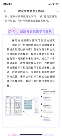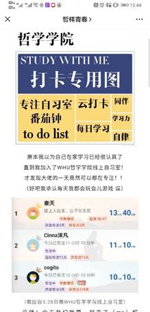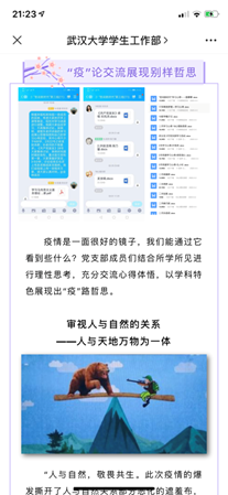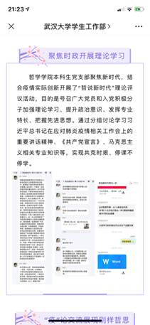 党团活动作引领。党支部开展线上学习活动,增强战“疫”必胜的信念,发挥出关键时期党支部的战斗堡垒作用。本科生党支部创新开展了“哲说新时代”理论学习评议活动,勉励同学们居家读经典、学习新思想、提升新境界。部分党员、入党积极分子学生主动向所在社区(村)报到,走到抗“疫”一线,热心回馈社会。学生会第一时间向同学们发出“停课不停学,居家读经典”倡议,各团支部分别举行“涓滴之水成海洋,颗颗爱心是希望”“青春战‘疫’,共克时艰”网上主题团日活动,组织团员青年学习习近平总书记关于打赢疫情防控阻击战重要指示精神、学习疫情防控知识、交流学习心得,团结带领团员青年坚定信心主动应对疫情挑战。