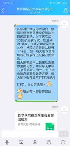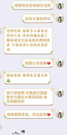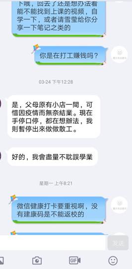 辅导员24小时的云守护。疫情期间,学院辅导员对学生的系统关怀体现在每一个普通的全天候日常:仔细摸排返乡学生的每日动态,建立在汉学生QQ群,点对点密切联系;对于因疫情造成各类困难的学生,帮助申请临时困难补助或专项困难补助;时刻关注学生心理状况,及时给予心理疏导;及时与家长保持联络,给予家校协作;召开线上年级大会、主题班团会,加强与学生的沟通和疫情期间的思想引领;密切联系毕业班学生,及时了解其就业进度、毕业设计进度,及时帮助就业困难学生解决问题。