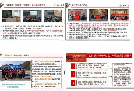 兰州大学哲学社会学院哲学研究生党支部不断探索创新理论学习形式,将专业性与政治性、时代性相结合。持续开展并总结了“读原著、学原文、悟原理”系列学习交流会,坚持“学懂、弄通、做实”原则,打造理论学习品牌特色活动,将理论学习常态化、制度化。同时倡导支部同志积极参加疫情防控志愿服务,将理论学习内化于心、外化于行。