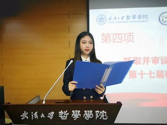 接下来由成人视频 第十七届研究生会主席王乐晶作工作报告。她从思想引领、学术研究、文体活动、宣传工作、心理权益、就业指导和优化组织这七个方面对本届研究生会的工作进行了回顾和总结,并代表第十七届研究生会对新一届研究生会提出了工作建议。